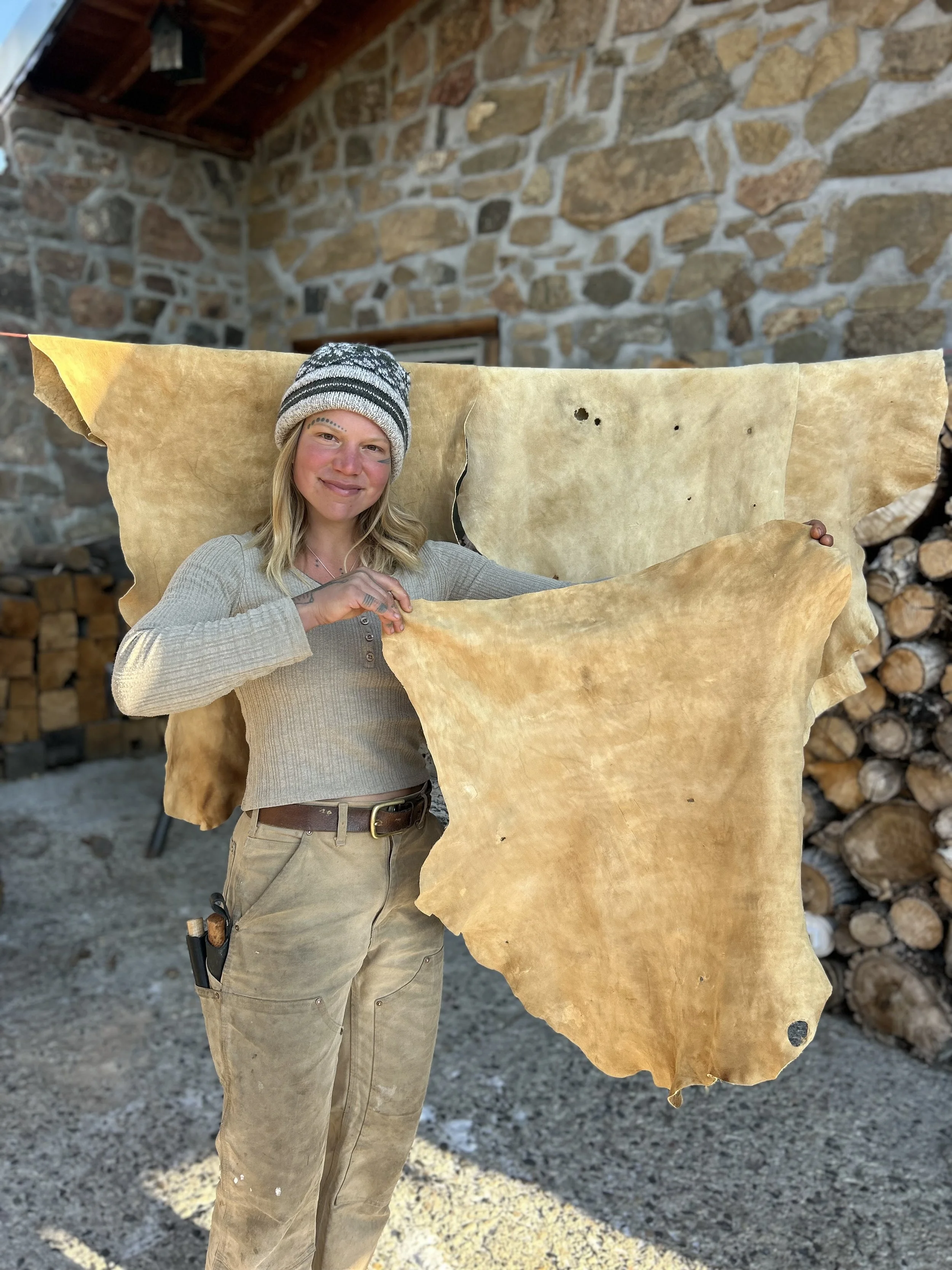 Over 3-5 days you will scrape the hair and epidermis from the hide, membrane it, flush out hide glues, brain it (dress it), wring it, soften it and then you'll smoke the softest material you've ever felt to preserve the finished hide!